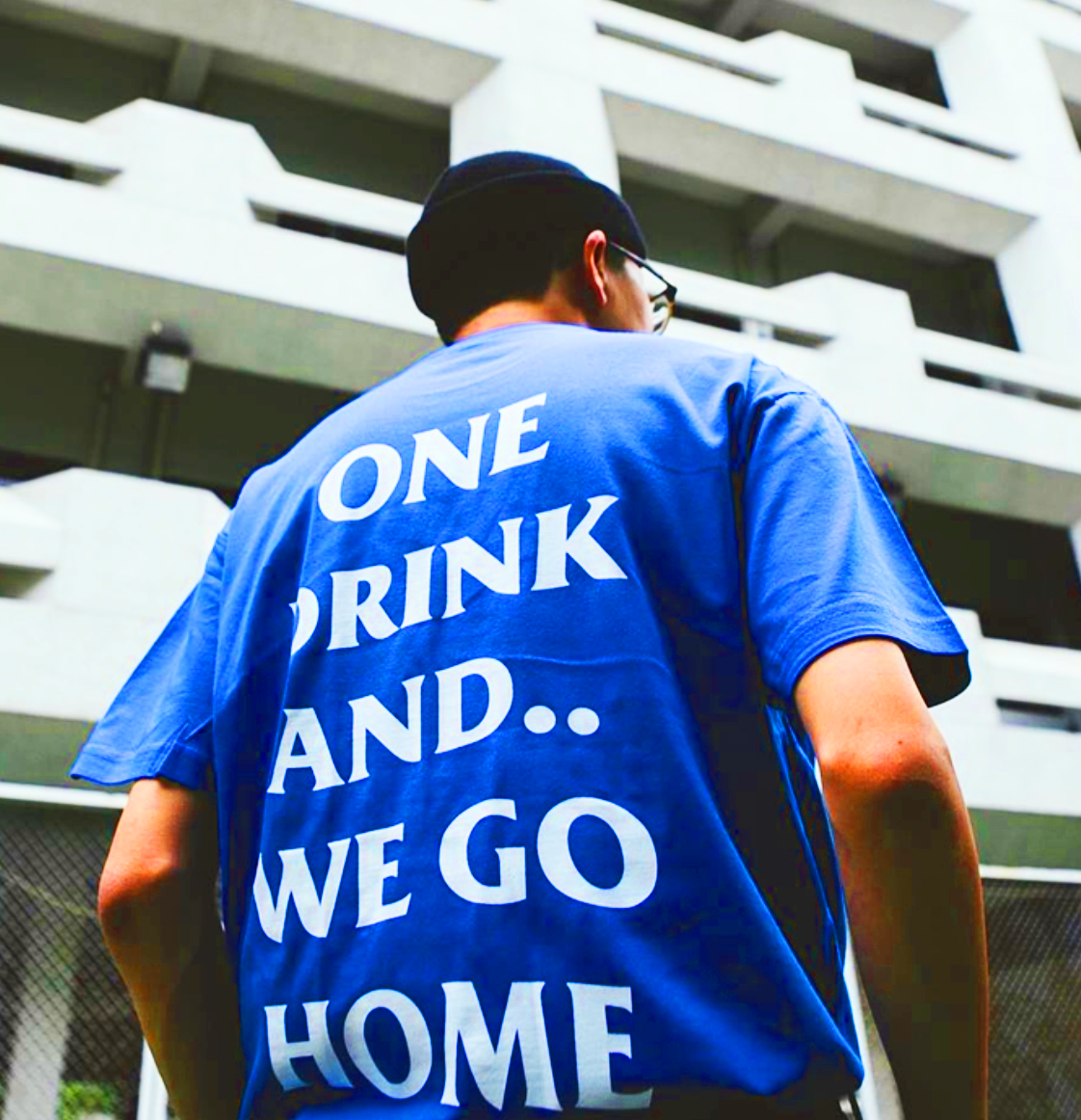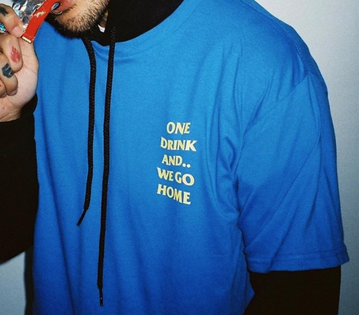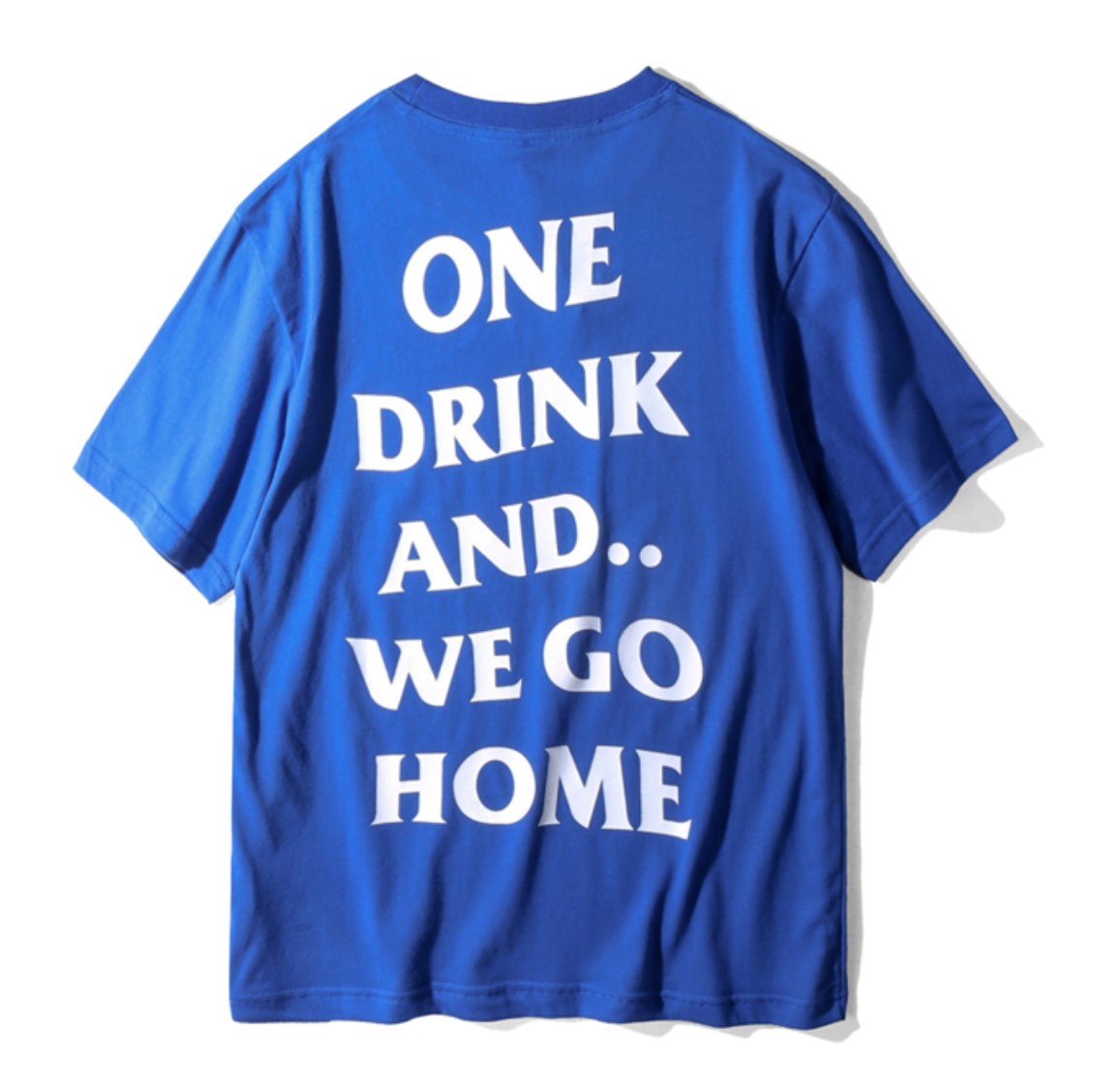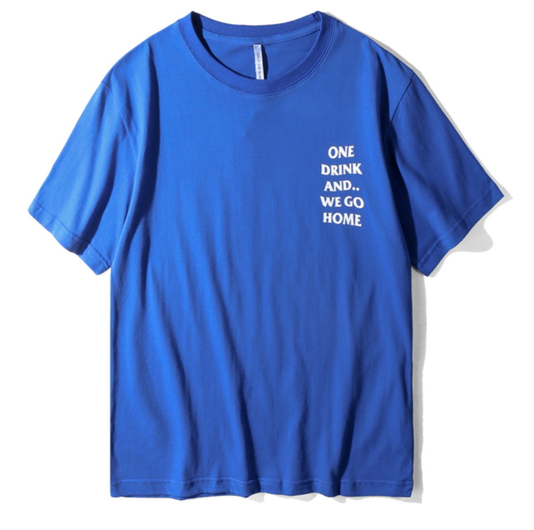 ONE DRINK AND WE GO HOME T SHIRT IN BLUE