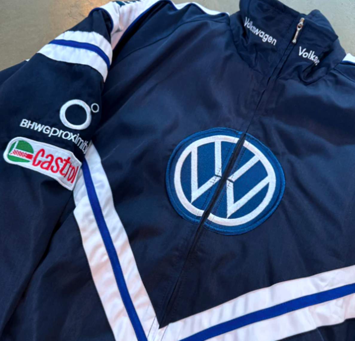 Volkswagen Motorsport Castrol Racing Jacket – iconic navy with the legendary blue-white V-stripe, Pirelli shoulders and that massive VW badge hitting center stage. From the WRC stages to the streets, this is timeless motorsport heat.